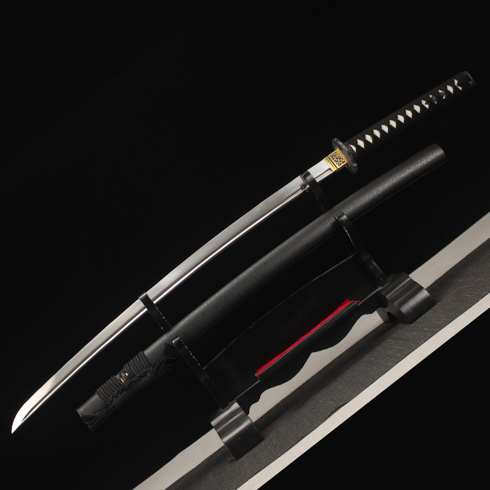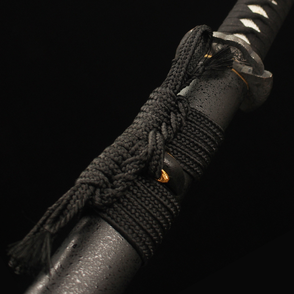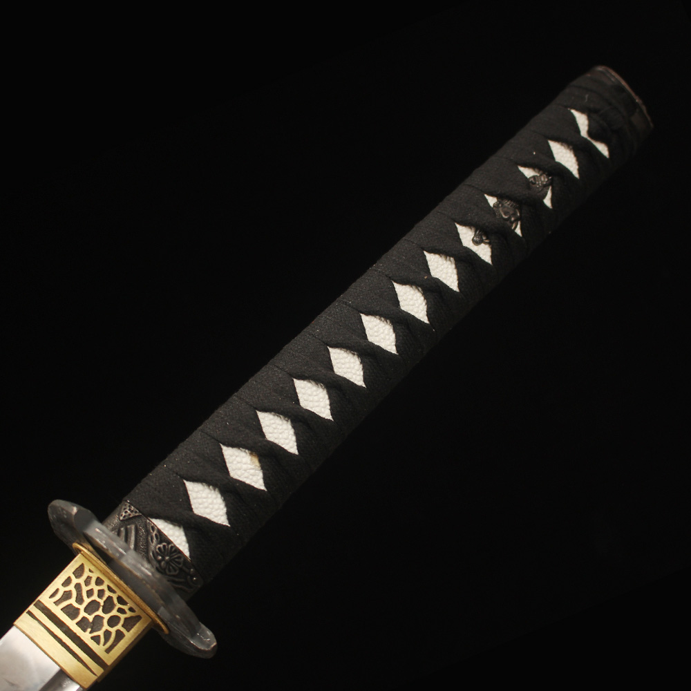 • Japanese katana is made of 1060 carbon steel, it features an zinc alloy tsuba, Black scabbard, black cord handle with Fake White ray-skin wrap and copper fittings.
