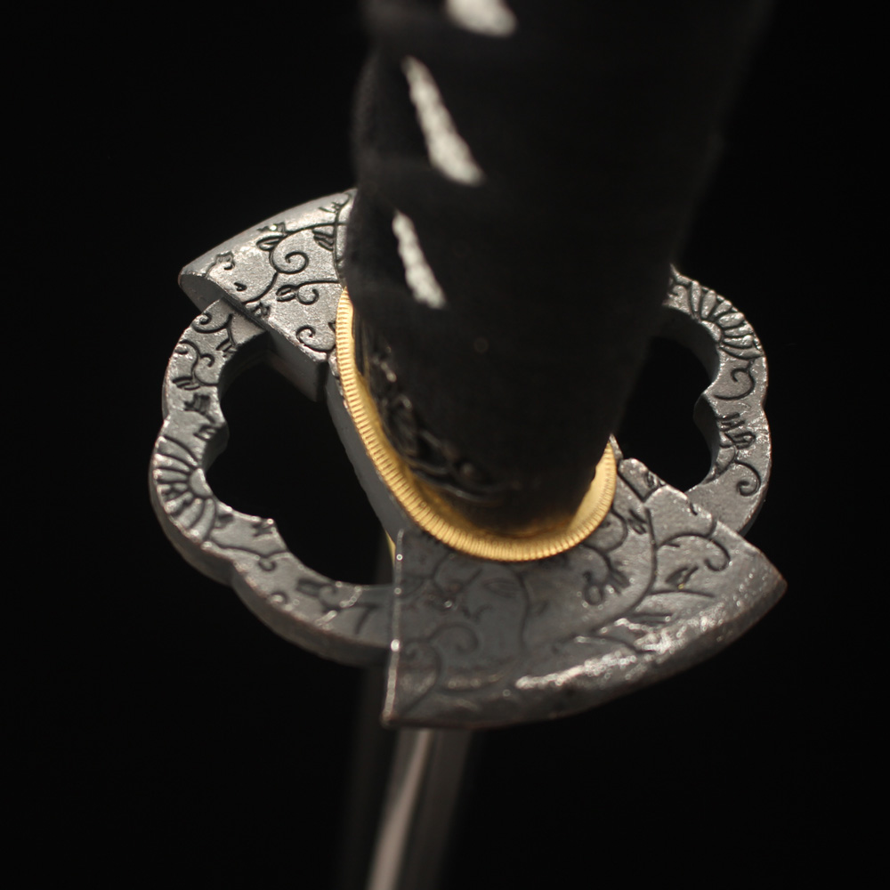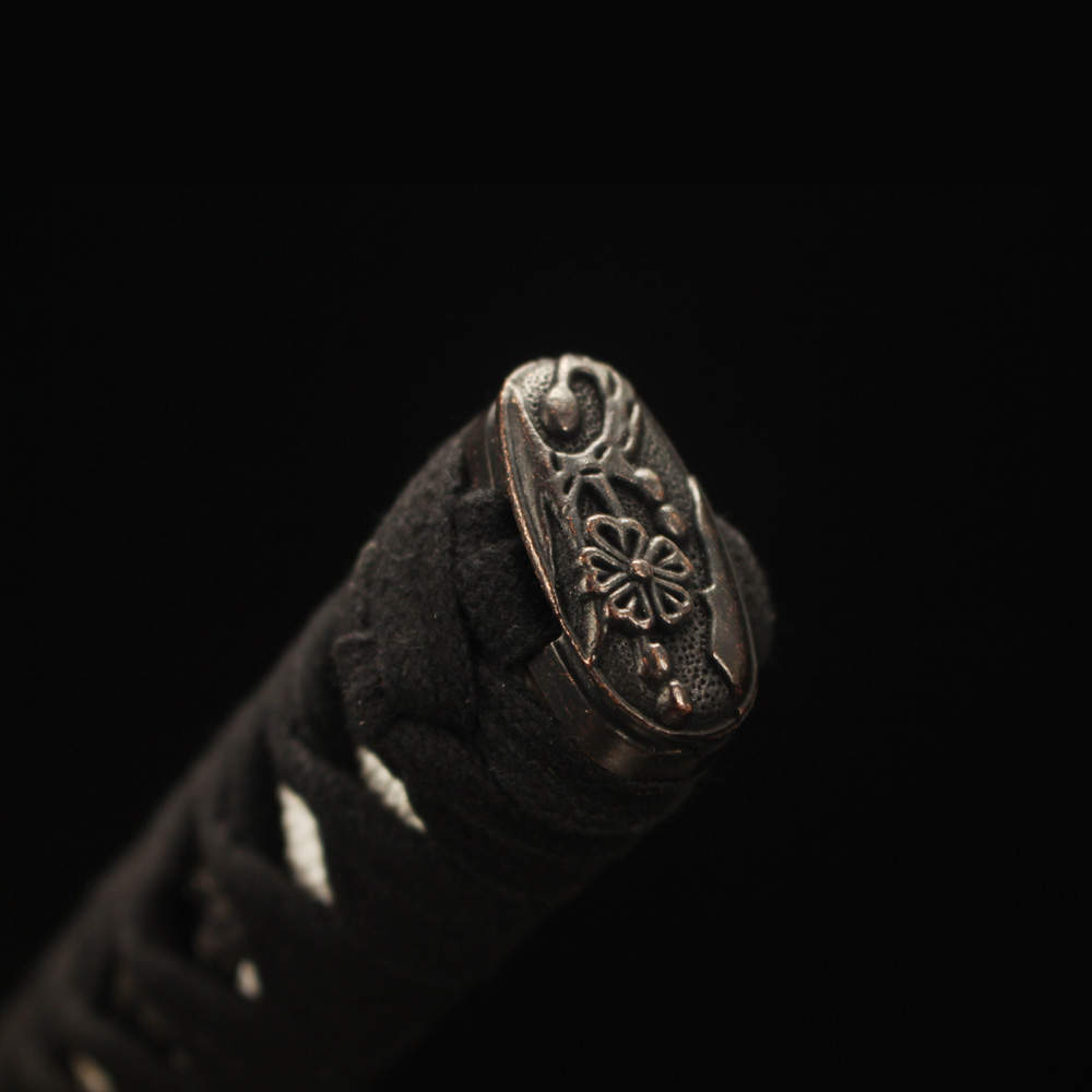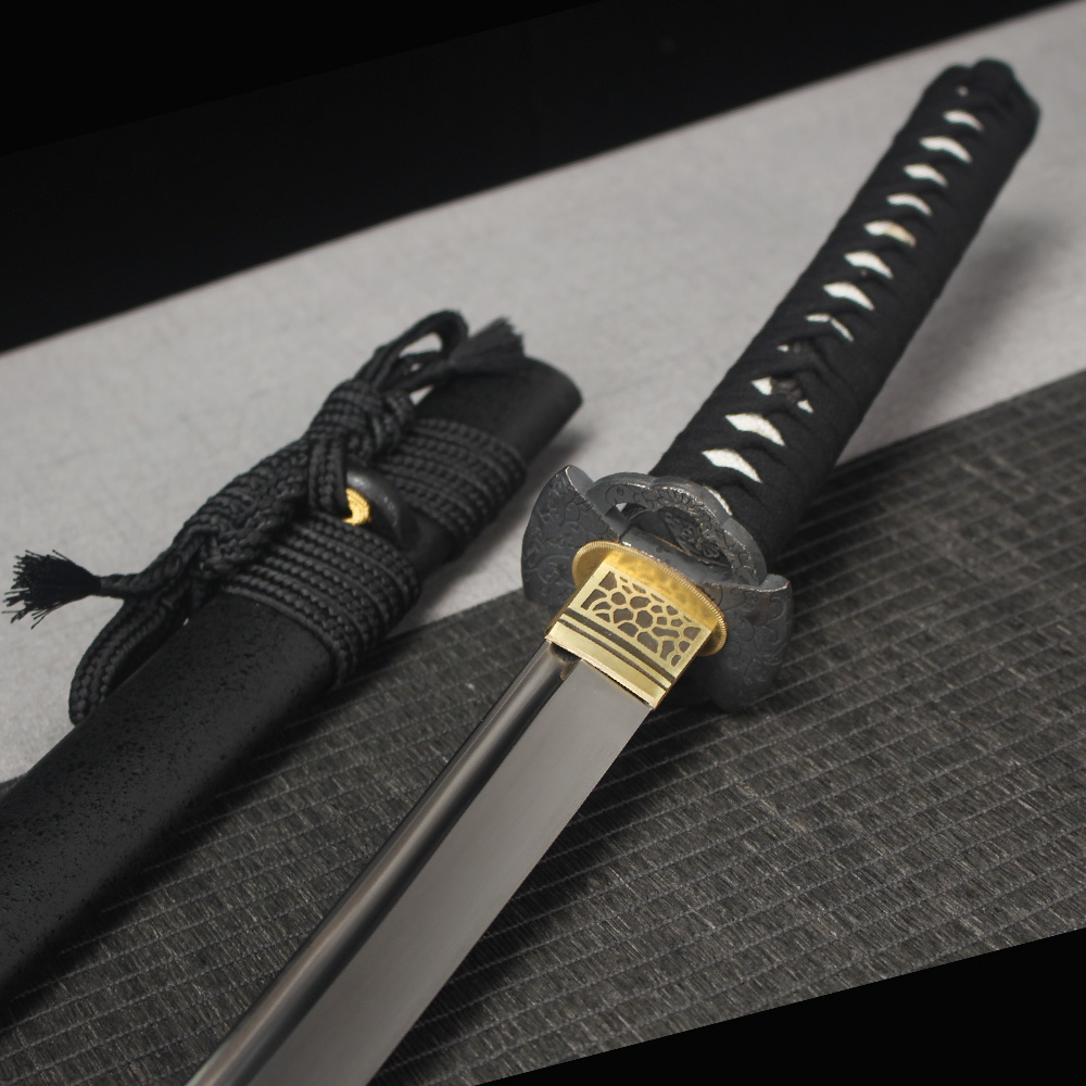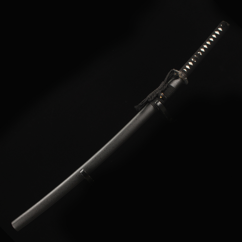 • Japanese katana is made of 1060 carbon steel, it features an zinc alloy tsuba, Black scabbard, black cord handle with Fake White ray-skin wrap and copper fittings.