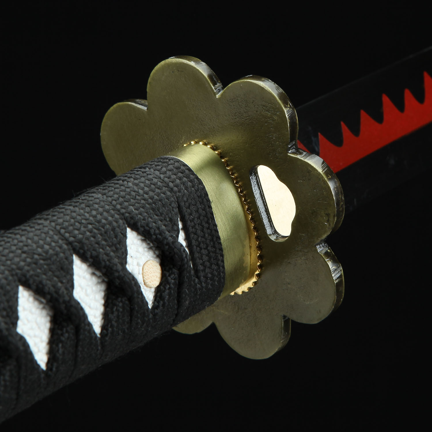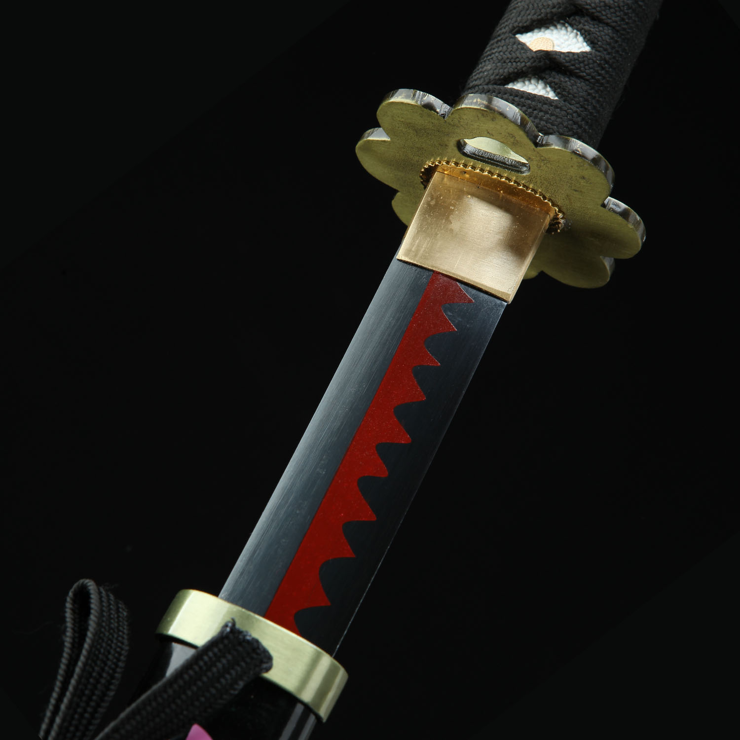 The Shusui Katana comes with a black hardwood saya (scabbard) that is coated with premium natural lacquer, providing a sleek and glossy finish. The saya features a manga-themed design that pays tribute to the One Piece series and adds a unique touch to this exceptional sword.
