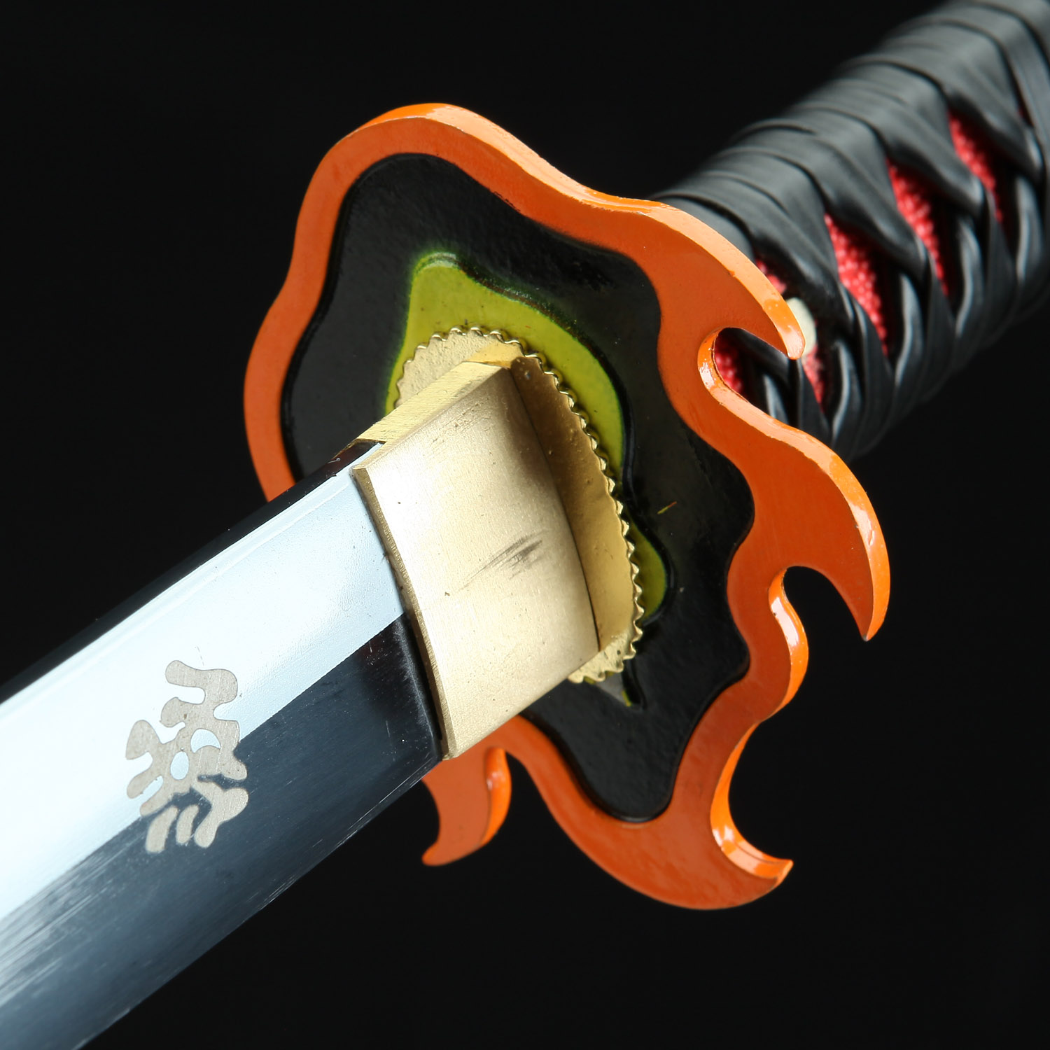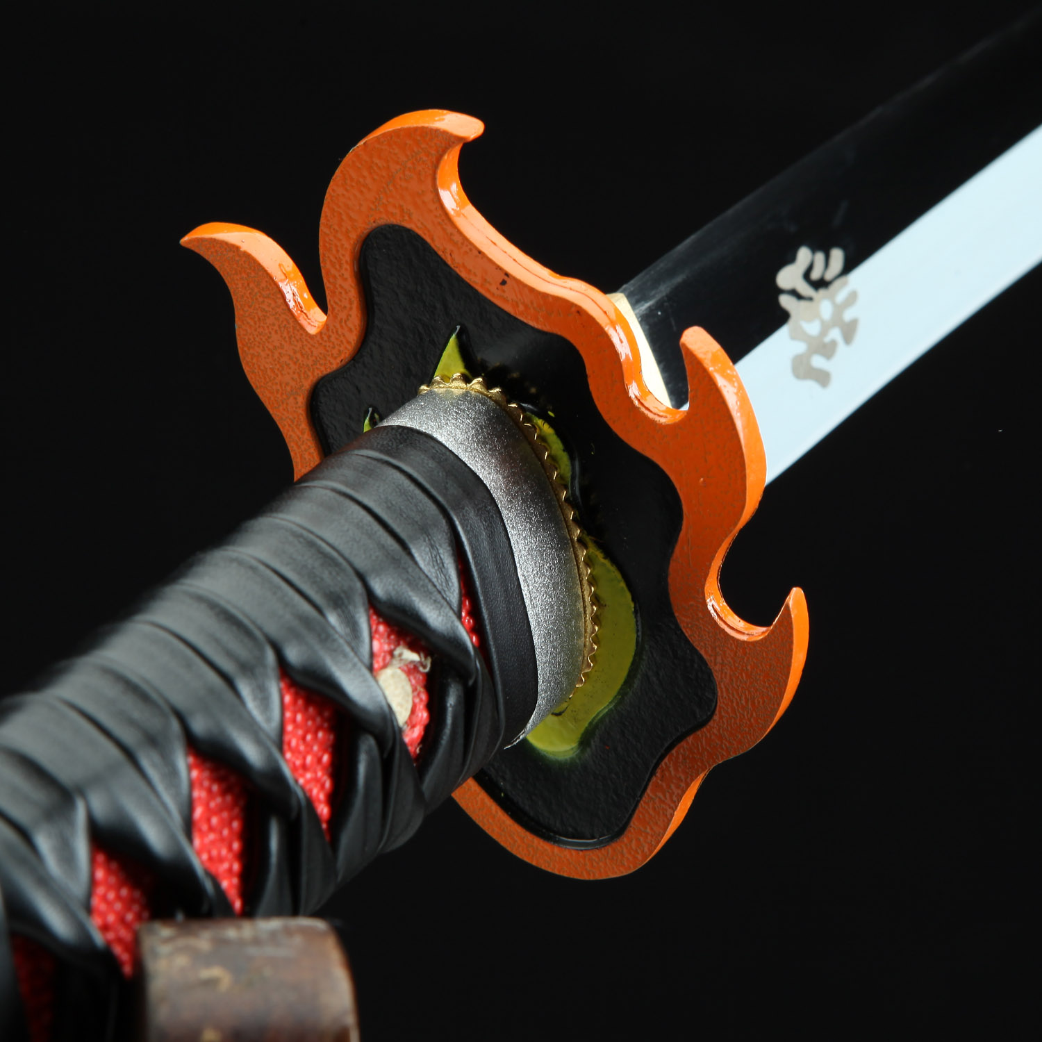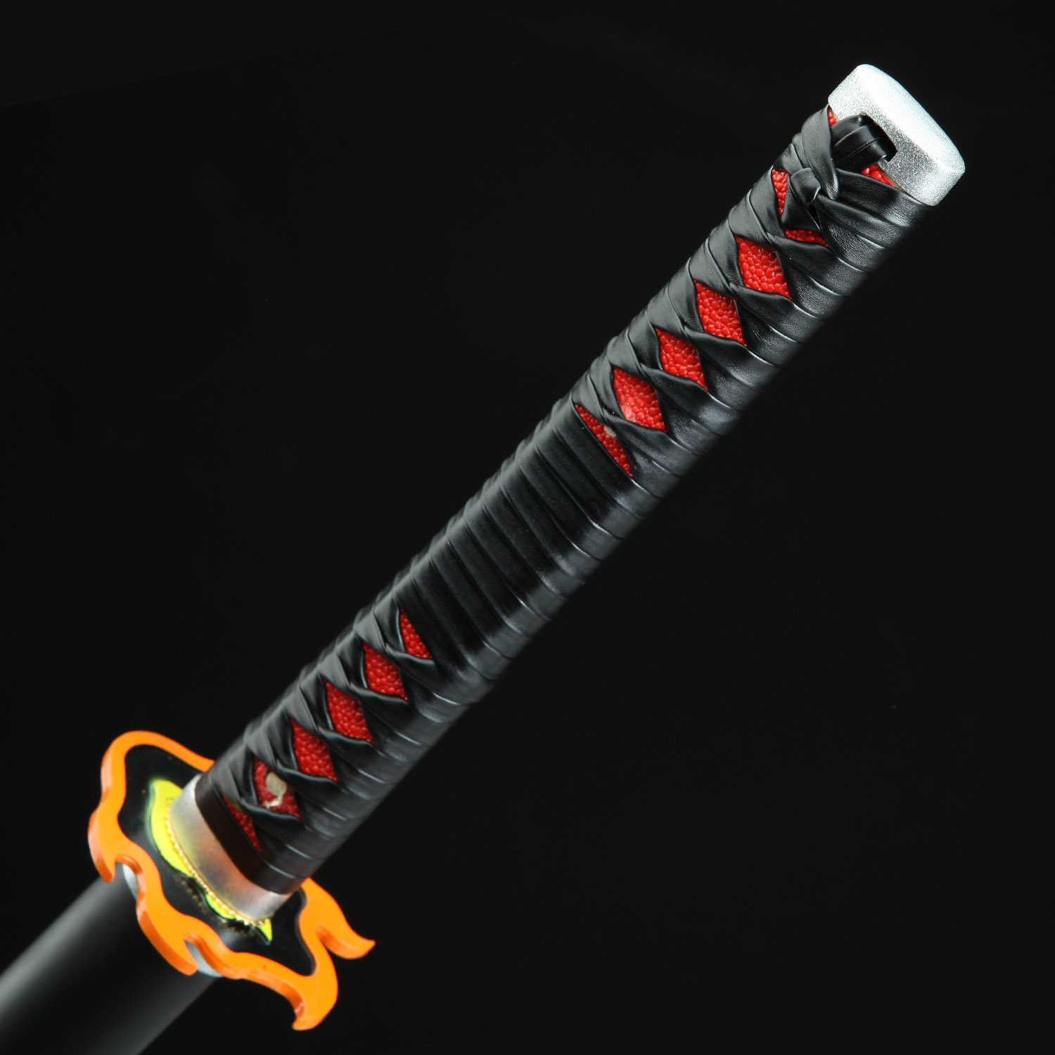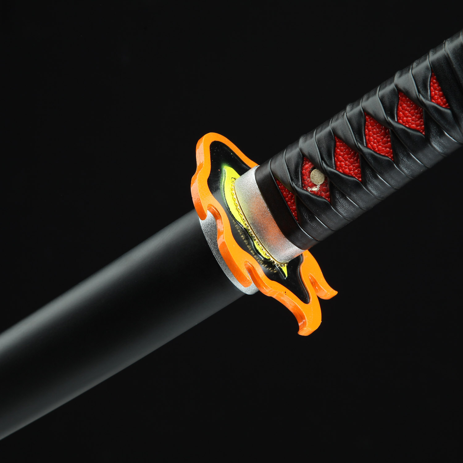 The handle of this exquisite replica is decorated with PU red samegawa (ray skin), providing a comfortable and secure grip. The intricate black leather wrappings lend an air of elegance to the design, while also offering a nod to the traditional tsukamaki technique used in Japanese swordmaking. The attention to detail doesn’t stop there – the iconic flame-shaped alloy tsuba features a red core and an orange border, accurately reflecting the design seen in the series.