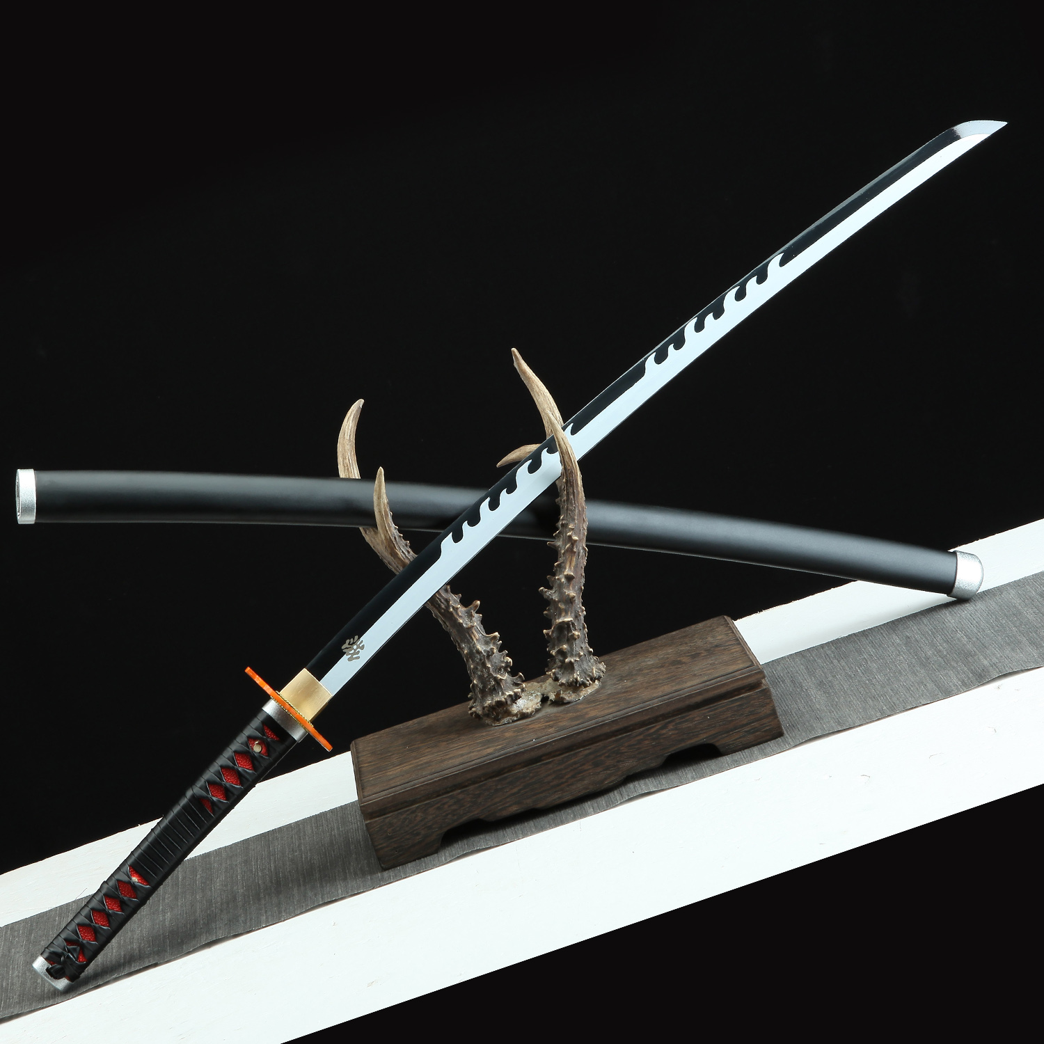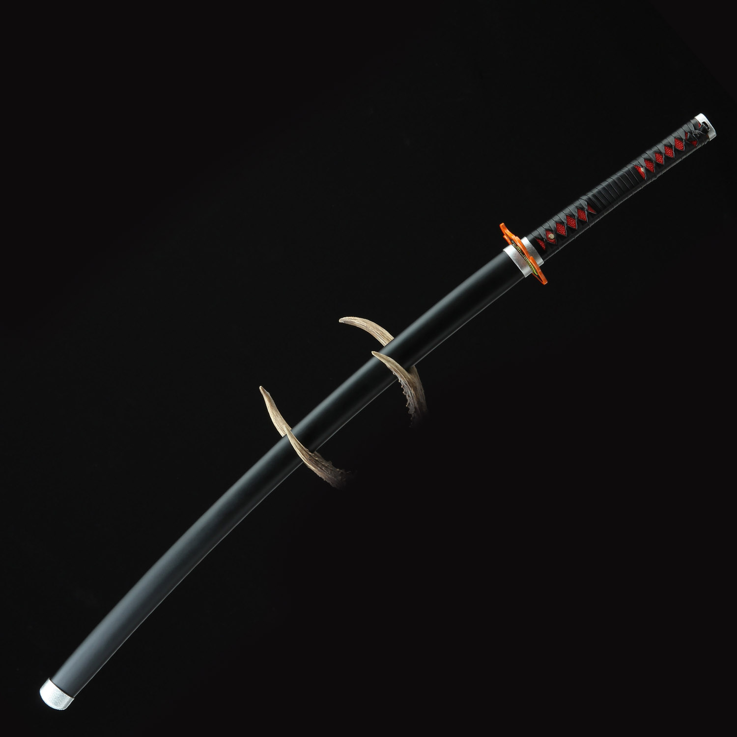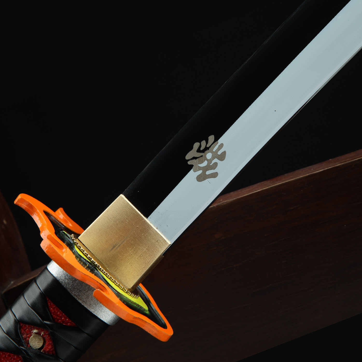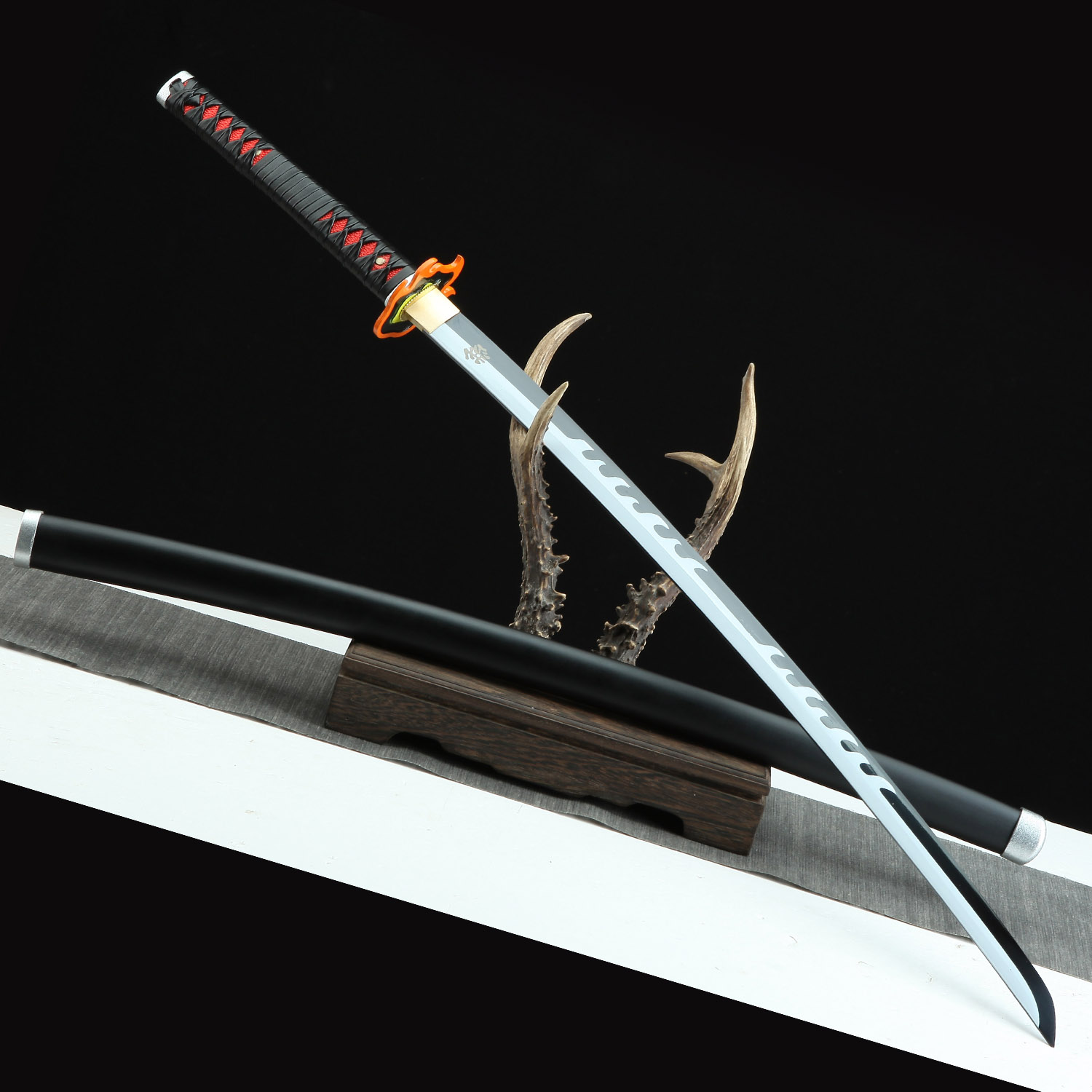 The handle of this exquisite replica is decorated with PU red samegawa (ray skin), providing a comfortable and secure grip. The intricate black leather wrappings lend an air of elegance to the design, while also offering a nod to the traditional tsukamaki technique used in Japanese swordmaking. The attention to detail doesn’t stop there – the iconic flame-shaped alloy tsuba features a red core and an orange border, accurately reflecting the design seen in the series.